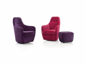 CONTESSA 1956 High-Back Chair. The original was the first modern piece of furniture produced by Wittmann after the war: a “sporty piece” raked sharply backwards and firmly upholstered like a sports car seat. All of the experience built up by the manufacturer over the past 60 years – as well as state-of-the art technology and materials – went into developing this modern-day reedition.