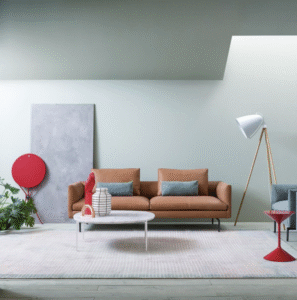 SMALL TABLE NIOBE 648 BY FREDERICA CAPITANI 2016 , MONOBLOC SOFA FLAMINGO BY DAMIAN WILLIAMSON 2017, ARMCHAIRS JUDY BY FRANK RETTNBACHER 2017